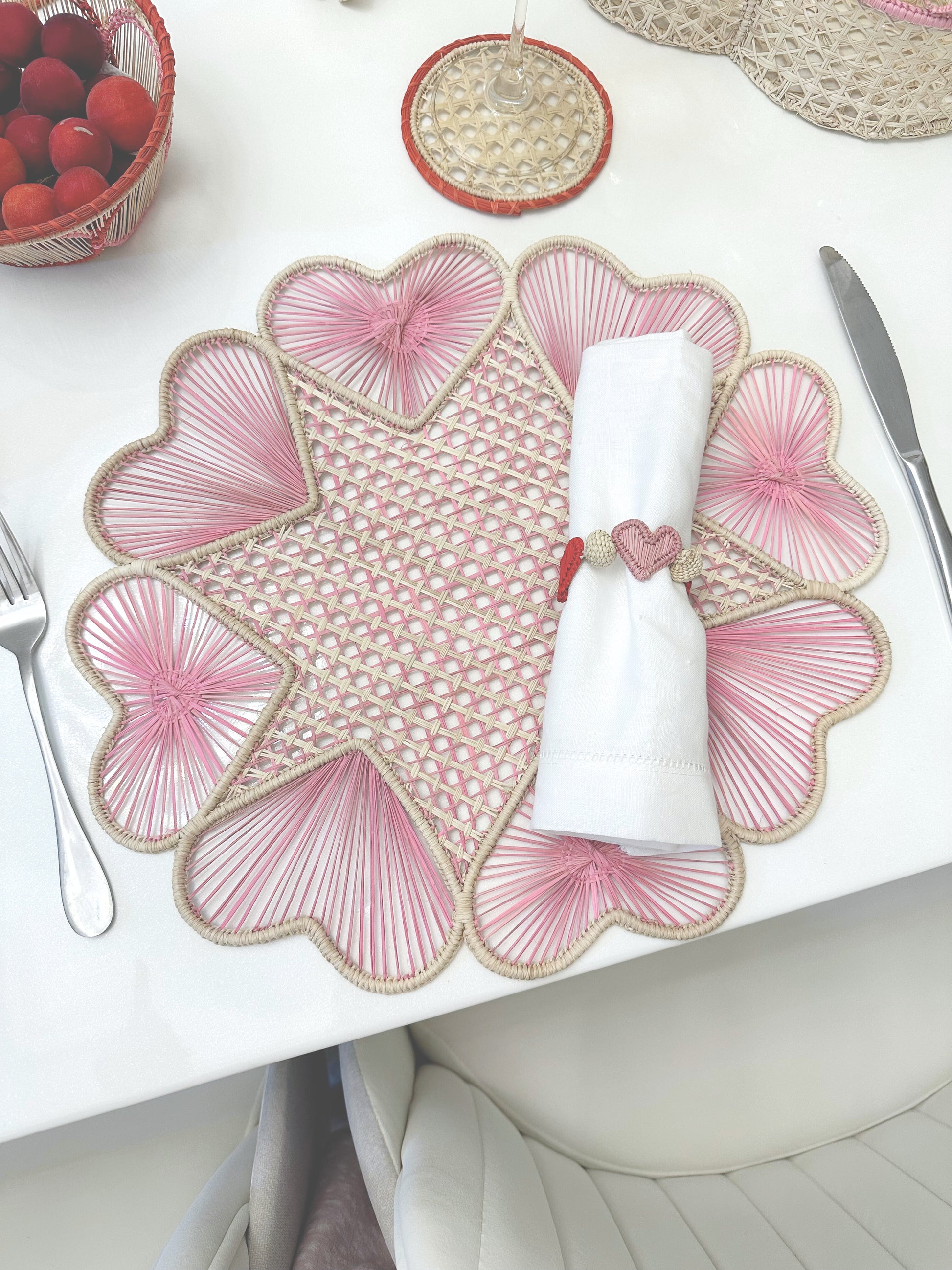 Crafted by skilled artisans in the Caribbean coast of Colombia, this Hearts II Placemat is shaped on a hand-welded wireframe and woven with Iraca palm, a natural, sustainable fiber known for its strength and delicate texture.