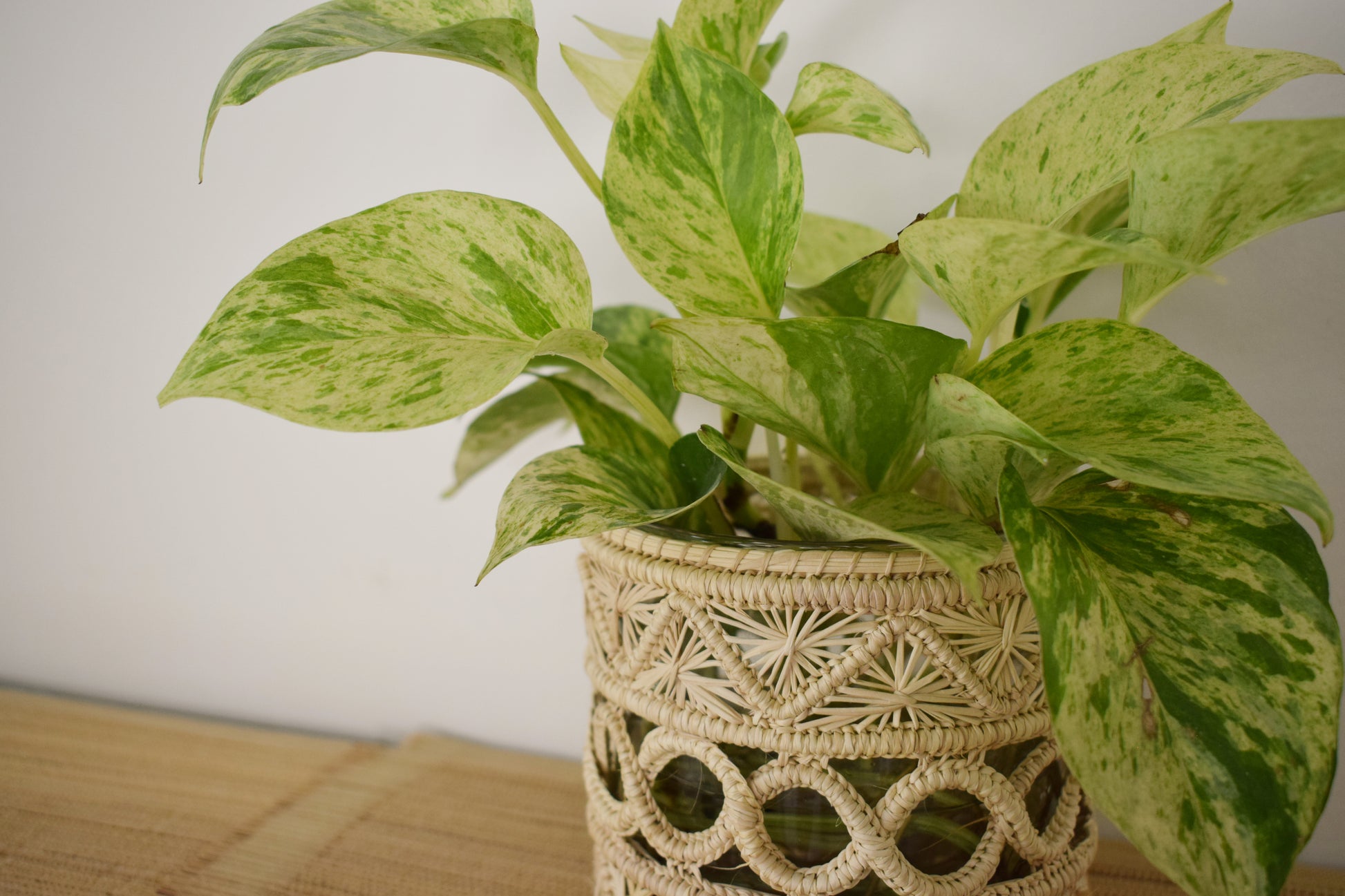 Magdalena Woven Glass Vase handmade by artisans in Colombia. Structure hand-welded and woven in natural raffia (iraca) fiber.