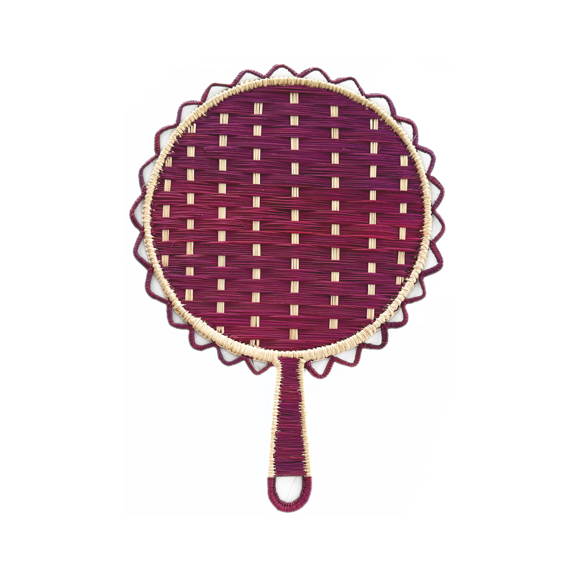 Crafted by skilled artisans in the Caribbean coast of Colombia, this Round Hand Fan is shaped on a hand-welded wireframe and woven with Iraca palm, a natural, sustainable fiber known for its strength and delicate texture.